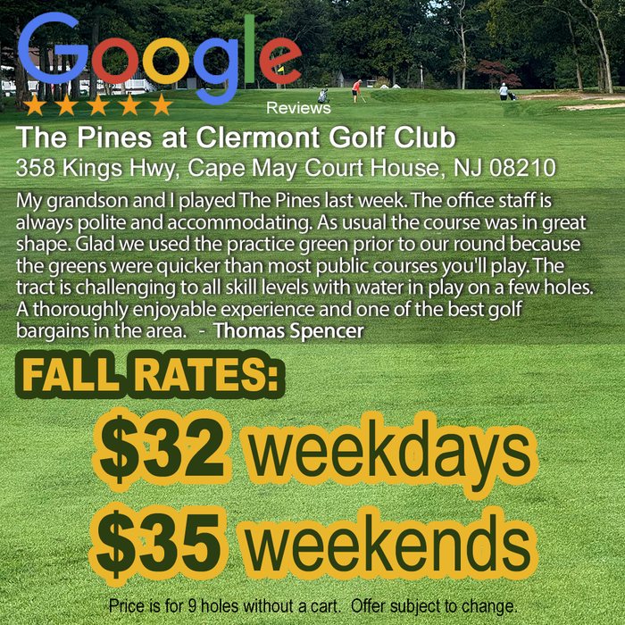The secret is out – the Pines at Clermont Golf Club is the place to play! We are located just off the Garden State Parkway, Exit 17 between sea Isle City and Avalon. Minutes from all Jersey Shore Resorts. Call or visit our website for a tee time today!
